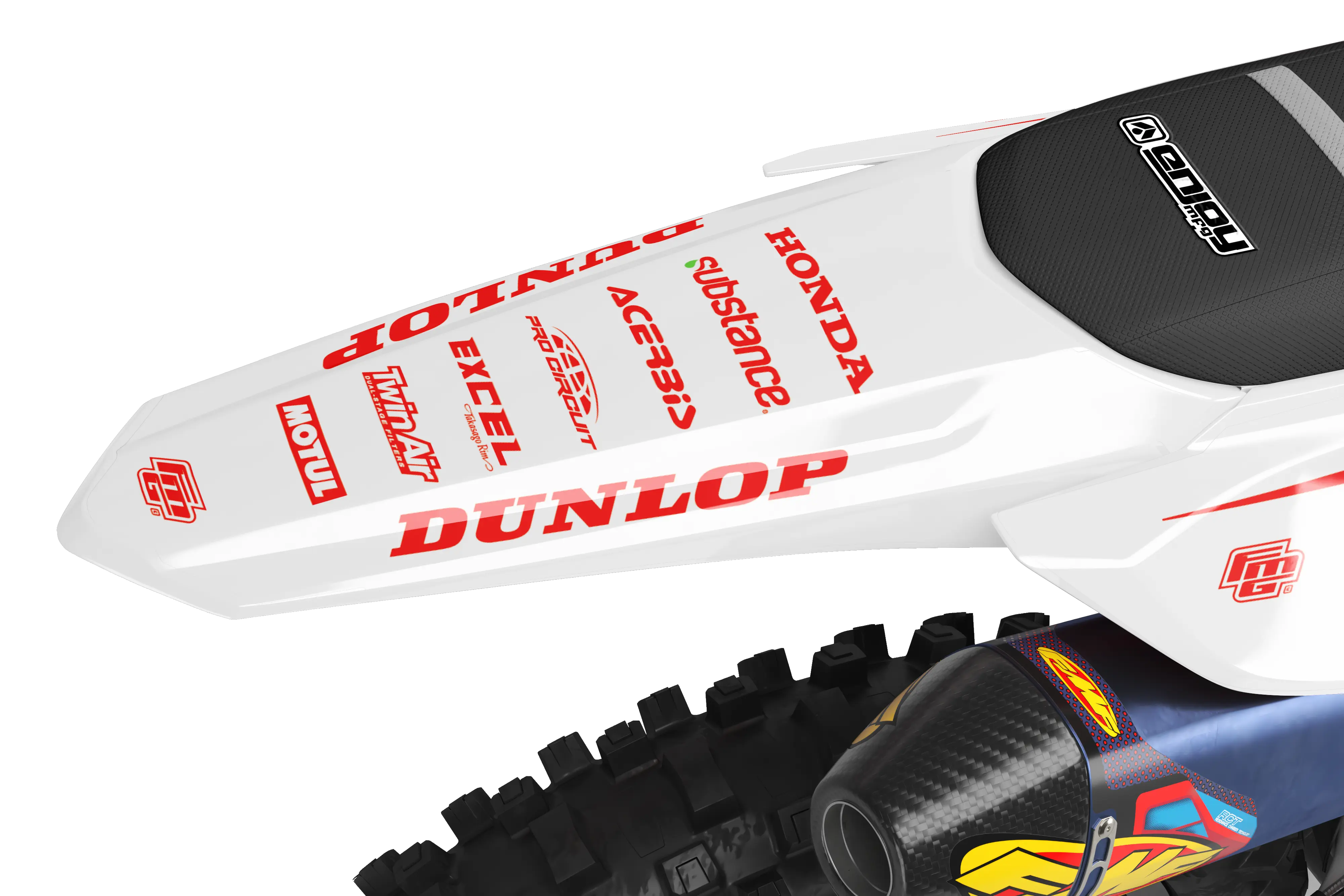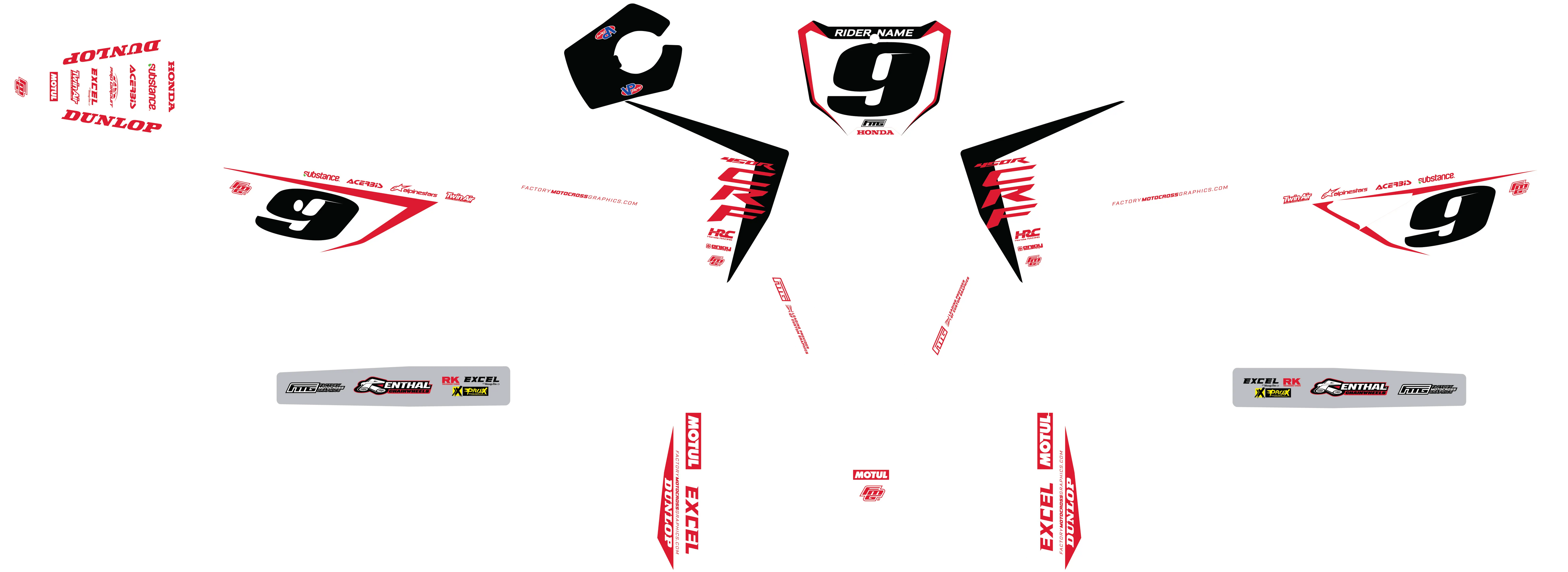 Je volledige grafische kit bevat het volgende: Voorspatbord Achterspatbord Rad Scoops (x2) Swingarm (x2) Onderste vorkbeschermers (x2) Nummerborden (x3) Luchtfilterkast - indien van toepassing Tank - indien van toepassing